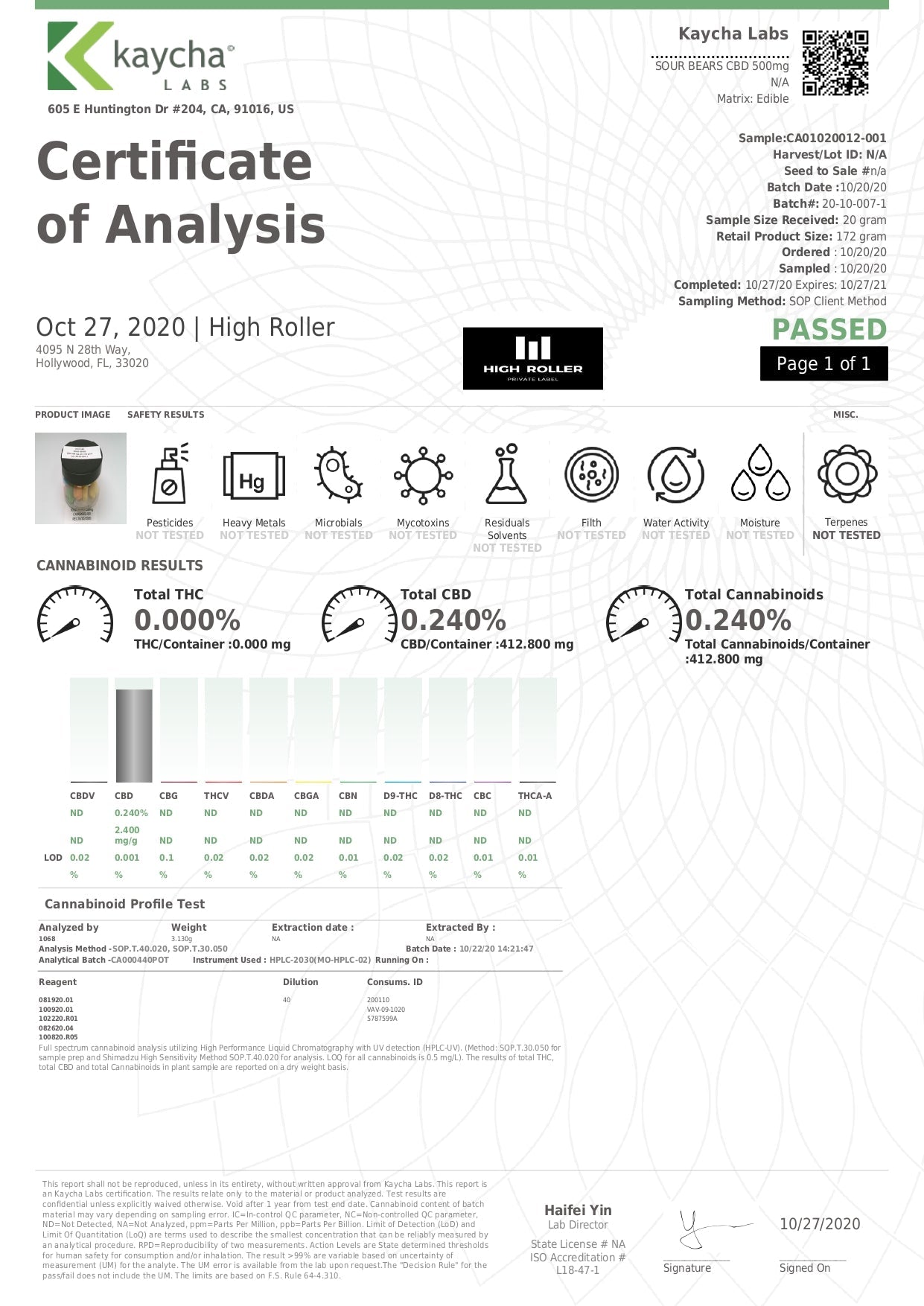 Corn Syrup (From Corn), Sugar (From Beets), Water, Gelatin, Lactic Acid, Citric Acid, Natural and Artificial Flavors, Fumaric Acid, Pectin (Derived from Fruit), Titanium Dioxide (Color), FD&C Yellow #5, FD&C Red #40, FD&C Yellow #6, FD&C Blue #1, Hemp extract CANNABIDIOL (CBD), COCONUT OIL.